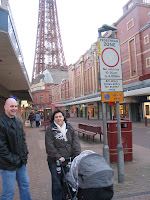 Abi settled well again last night but ste heard her about 3 so got up to her and fed her, she then slept till 8. Today was ste's Belated new year trip to Fleetwood and Blackpool for what else - you've guessed it chips. Abigail was really good only waking mid afternoon for a feed, but slept through the rest of the shopping and the sea at blackpool but did wake in Harry Ramsdens, Strange that!!!! Do you think Ste's teaching her early. She was then visited by her auntie Debbie who brought her loads of goodies and has thoroughly spoilt her. Heres a picture of her by blackpool tower with uncle peter and mummy. As you can see its typical seaside weather.